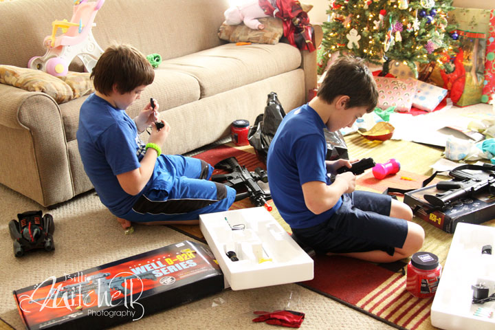 You can't tell from these two pictures, but they are unwrapping more guns. This time it's Nerf guns though. All the kids got Nerf guns from Aunt Jenny. Needless to say, I have been hit by more Nerf darts in the last week then I care to think about. And poor Peyton got shot right between the eyes with a dart.